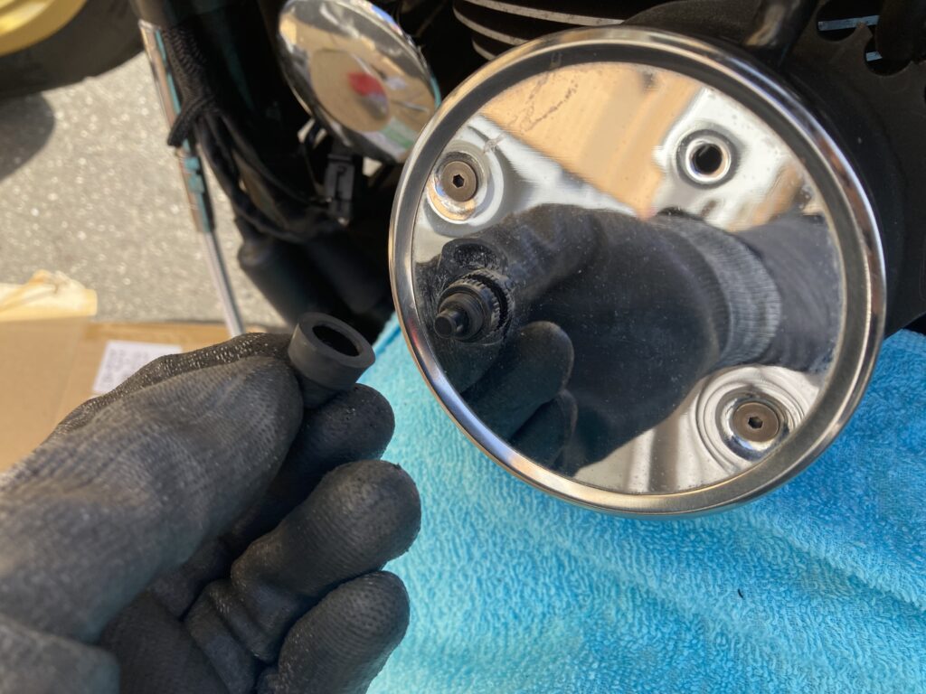 折れたステーを取り外したら、続いて新しいフロントフォーク用メーターステーの取り付けに進みます。