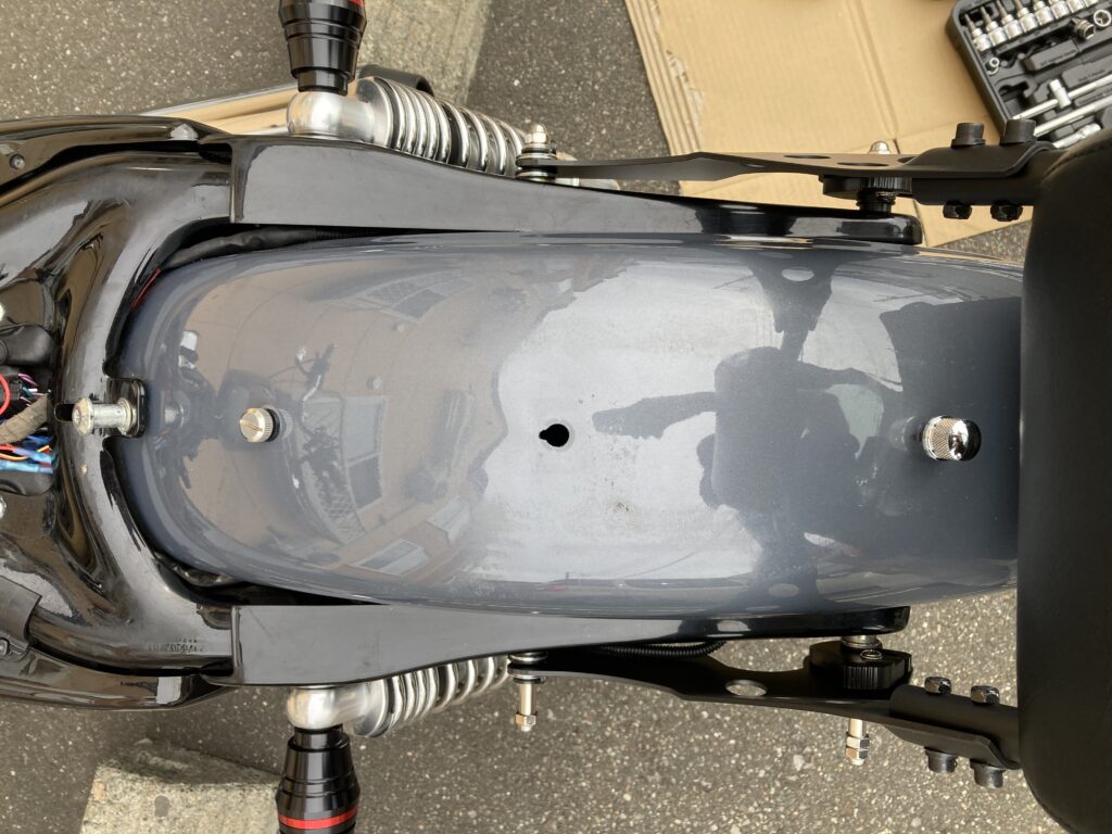 筆者のXL1200Lのシートは、リアフェンダー後方にある手締めボルト1本で固定されています。