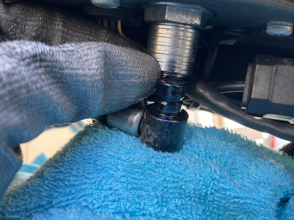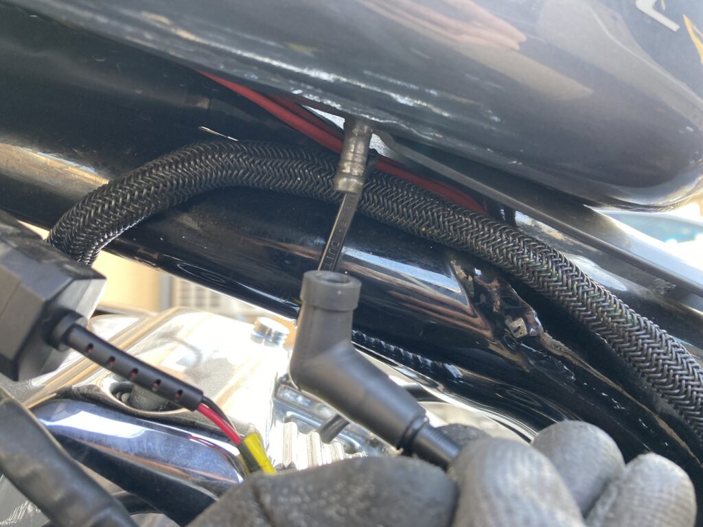 スペースが狭いため、角度をつけすぎるとタンクに工具が当たりやすい箇所です。