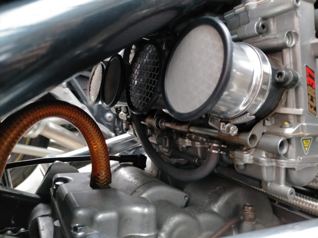 メッシュタイプのファンネルは、FCRキャブとの相性が良く、エンジン周りに統一感とメカニカルな雰囲気が出ます。