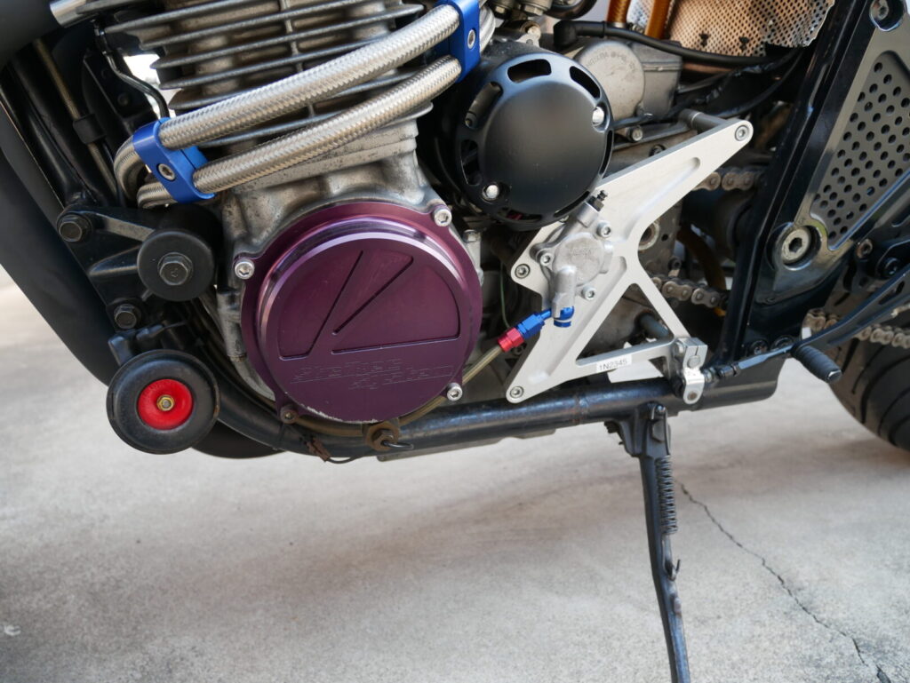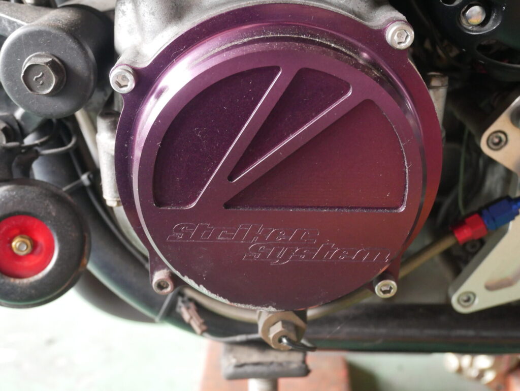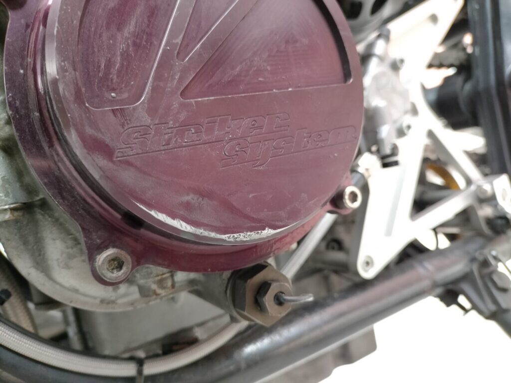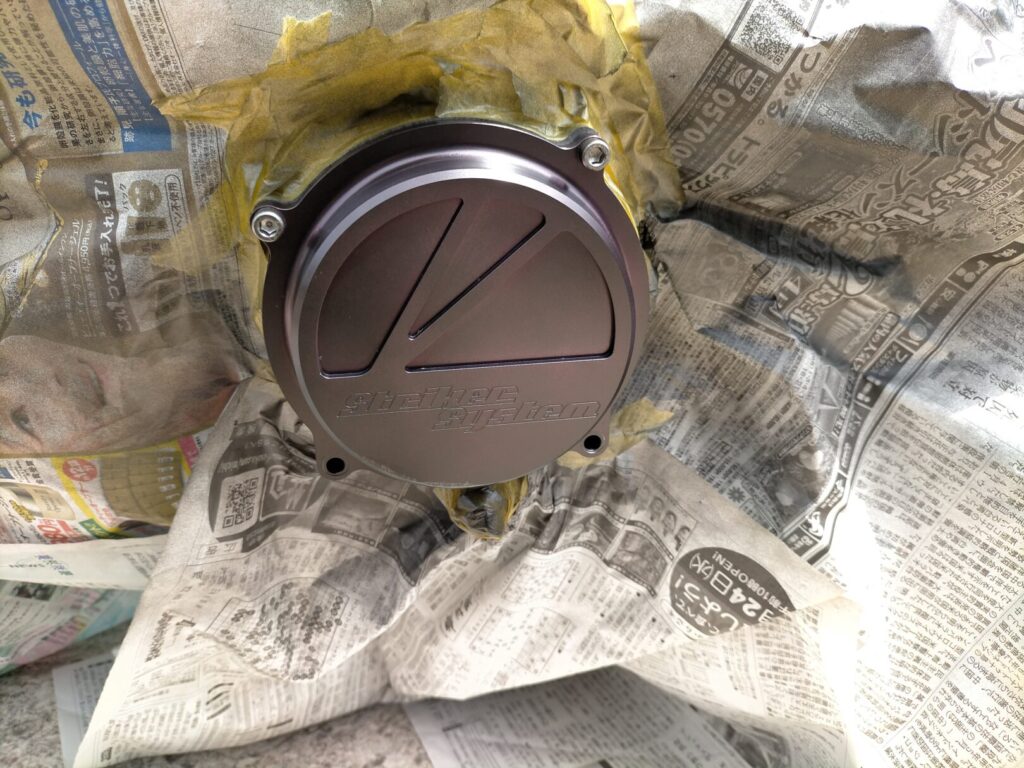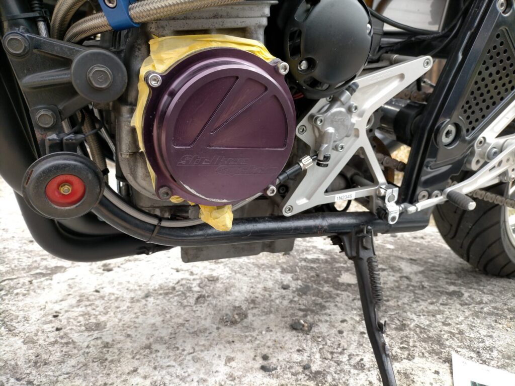 もともとはドレスアップ目的で装着されていた紫アルマイト仕様のカバーでしたが、時間が経つにつれて車体全体とのバランスが気になるようになりました。